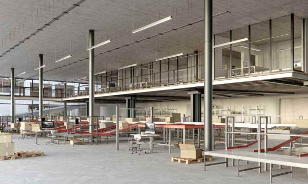 Im Herzen des Bestandes wird als erstes ein neues Wannenlager realisiert, flankiert von einem Hochregallager und einem automatisierten Kleinteilelager. Nach Abbruch des Bestandes und Ertüchtigung der benachbarten Bauteile wird eine Pfahlfundation zur Verformungsreduktion in den Molassefels erstellt. Nach Erstellung der Bodenplatte folgt der Neubau der Gebäudehülle in Holz für das neue Wannenlager.
