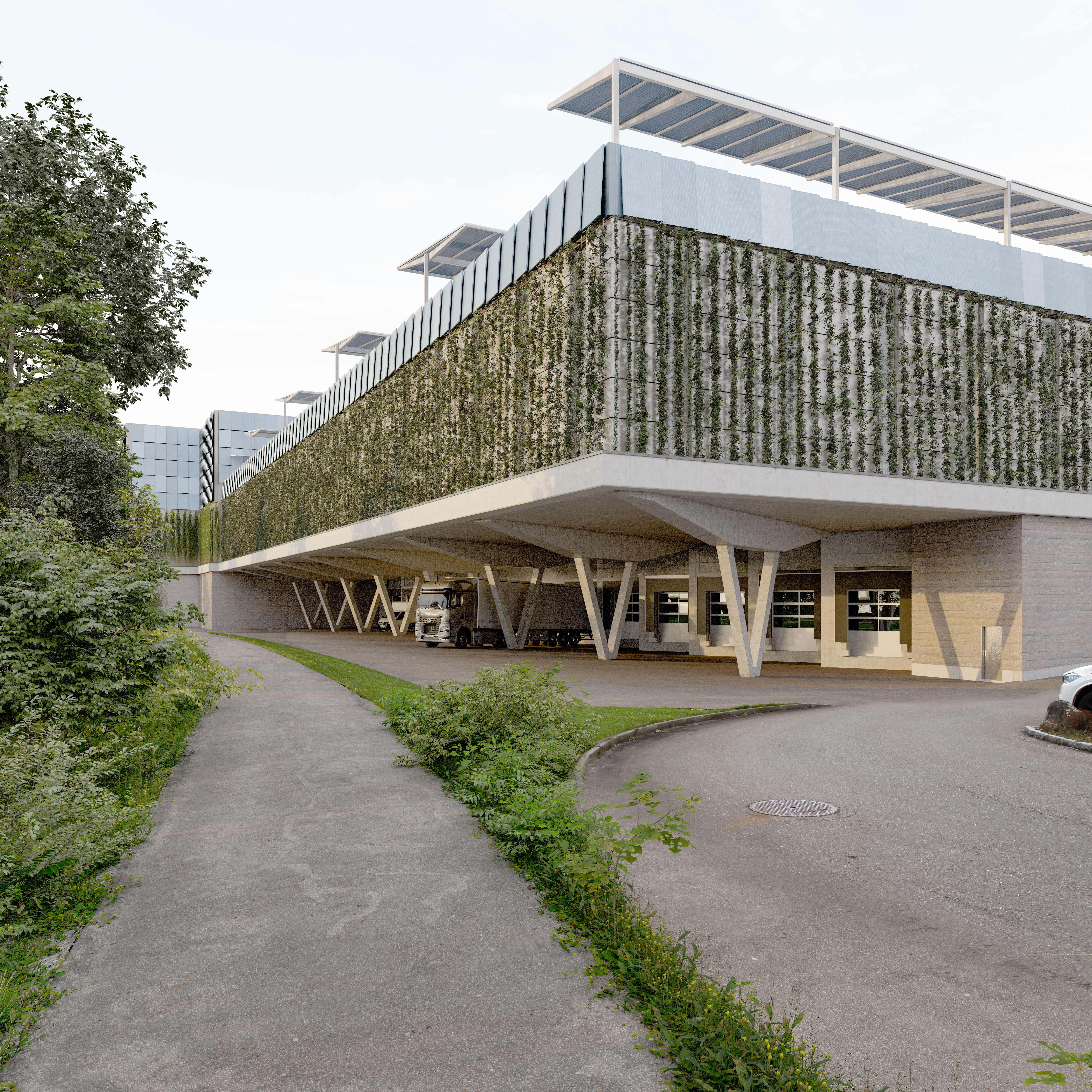 Der Neubau des Büros wird vom Untergeschoss bis zur Decke über dem Erdgeschoss in Massivbauweise erstellt, darauf folgen vier Geschosse in Holz mit einem aussteifenden Betonkern. Das Tragwerk unterhalb des Autostores Lagersystem unterliegt hohen Verformungsbeschränkungen. Aus diesem Grund wird das Tragwerk in Massivbauweise ausgeführt und mit Pfählen in den Felsen fundiert. Das Parkdeck über dem Autostore wird aus Holz errichtet.
