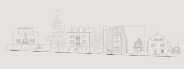 Die als Quartierschutzzone geschützte Bahnhofstrasse zeichnet sich durch solitäre Wohnbauten und markante Dachformen aus. Die asymmetrische Dachform des neuen Schulgebäudes nimmt Rücksicht auf die benachbarten Baukörper und verleiht der neuen Schule einen zeitgemäßen Charakter. Das neue Dach reagiert auf das dreigeschossige Nachbargebäude im Norden und stellt eine visuelle Verbindung zu der zweigeschossigen bestehenden Schule her. Trotz seiner subtilen kontextuellen Bezüge fügt sich das neue Gebäude mit Stolz in das geschützte Strassenbild ein.
